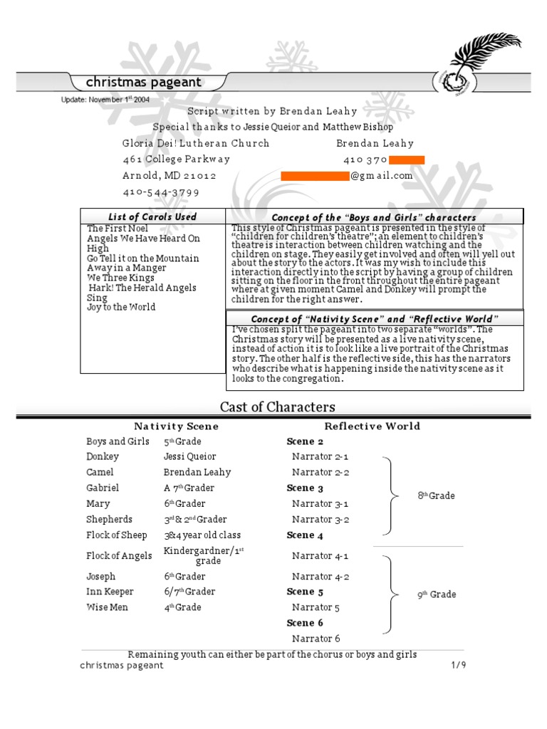 This parade of characters also features nine traditional christmas carols to be sung by the cast or a choir and the audience. Permission is granted to use these in your church. A joy for everyone. Christmas pageant matthew kozlowski word doc this script is for a 10 15 pageant in the no rehearsal tradition.