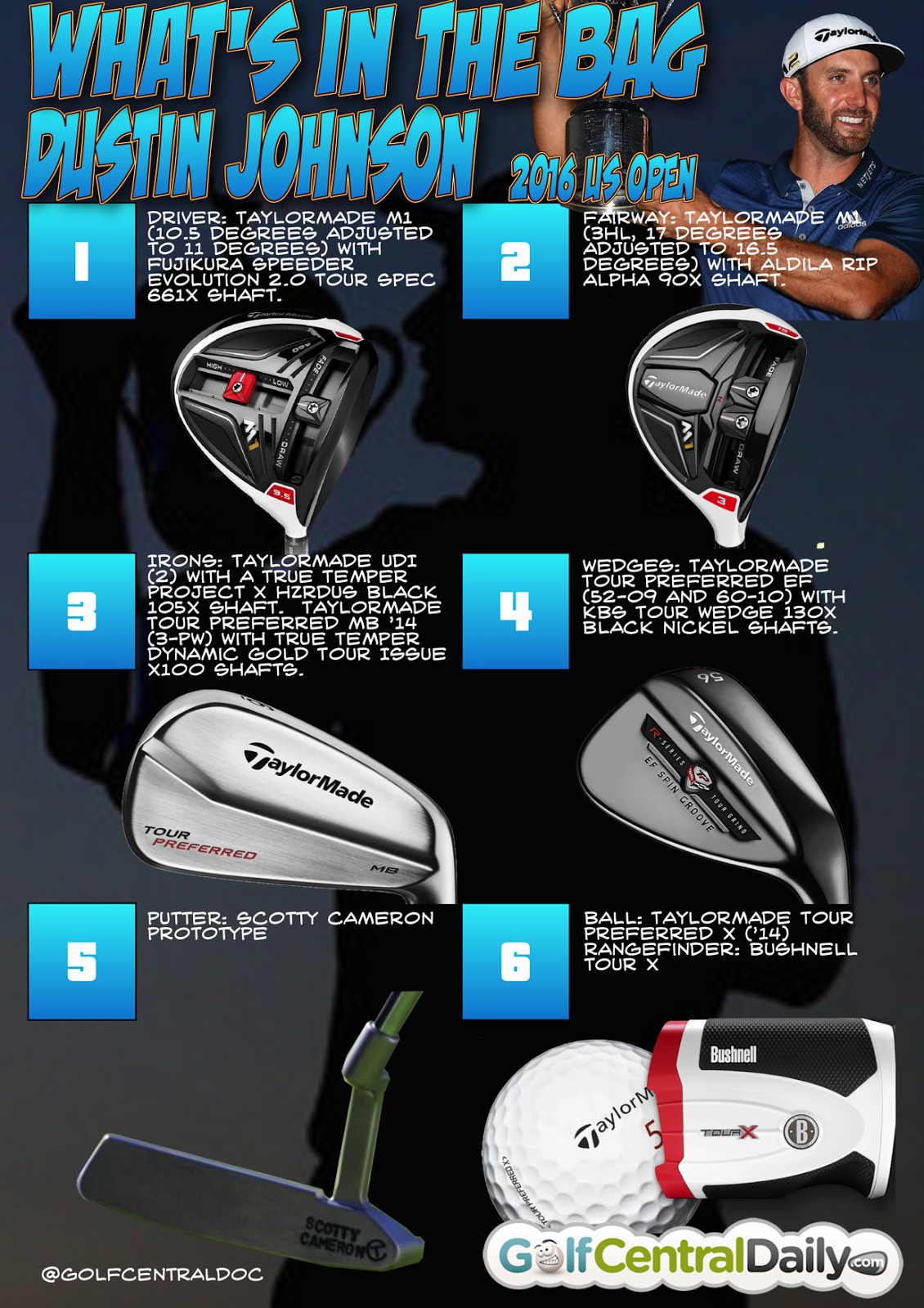 Dustin johnson whats in the bag. Tour report witb for team taylormade this week in augusta. Dustin johnson chose taylormade clubs to achieve excellence in distance and speed with every shot. Courtesy of golfwrx currently dj is 22nd on the pga tour in driving distance with an average of 3069 yards off the tee.